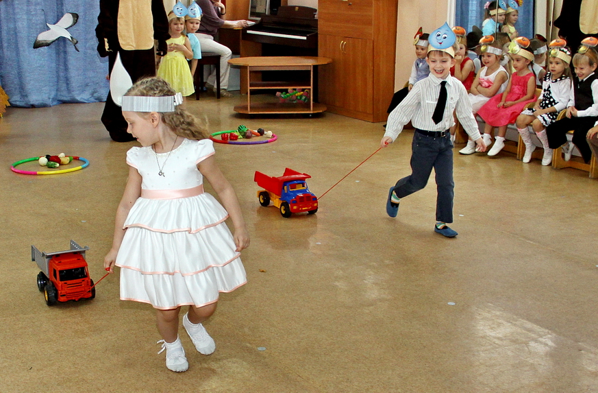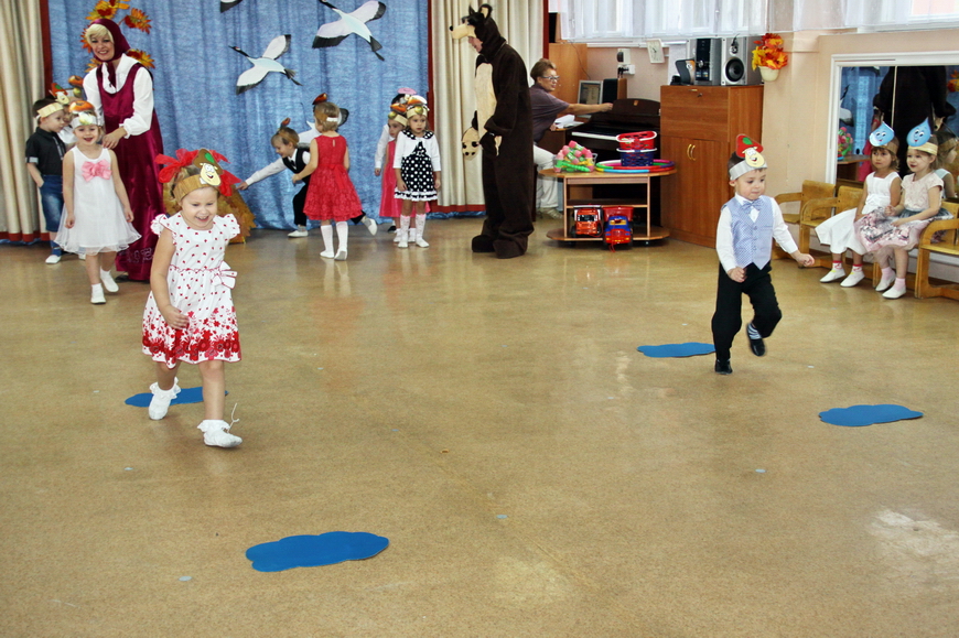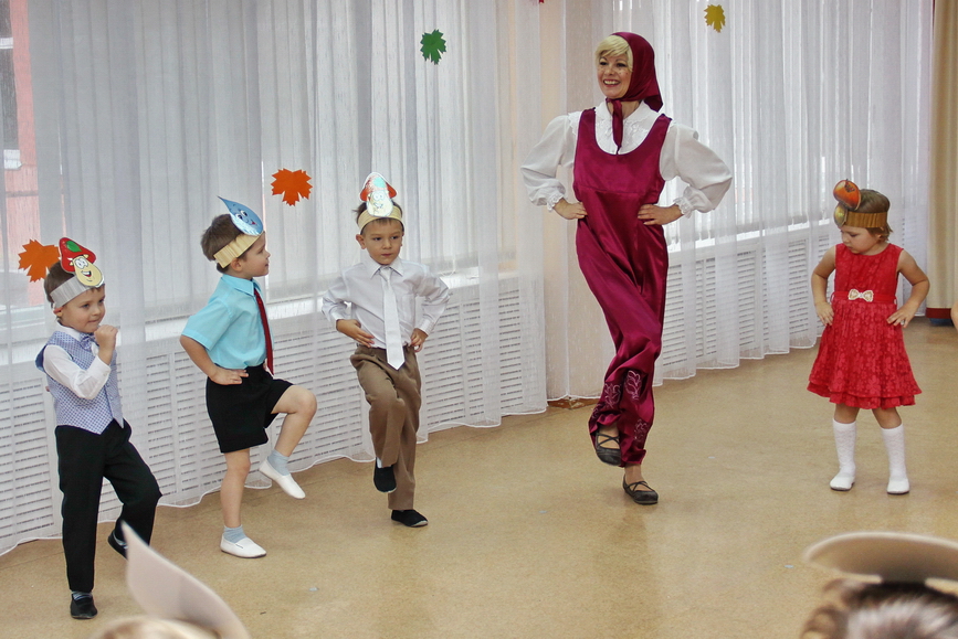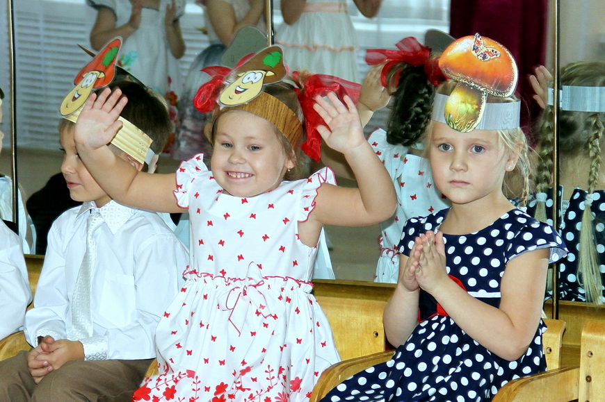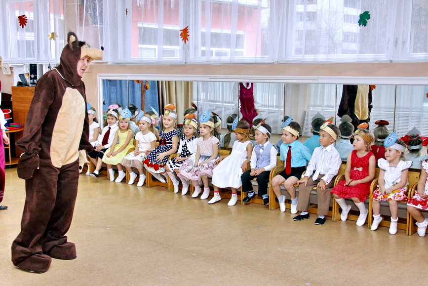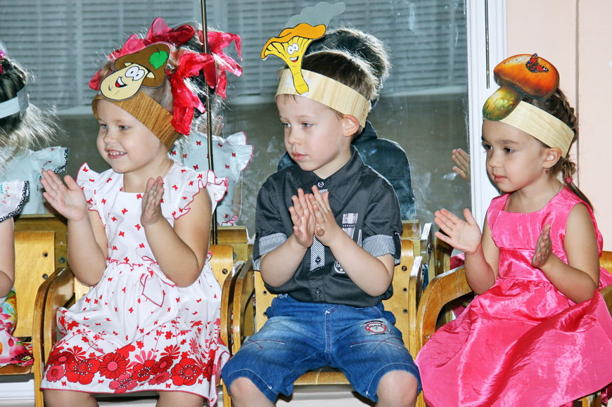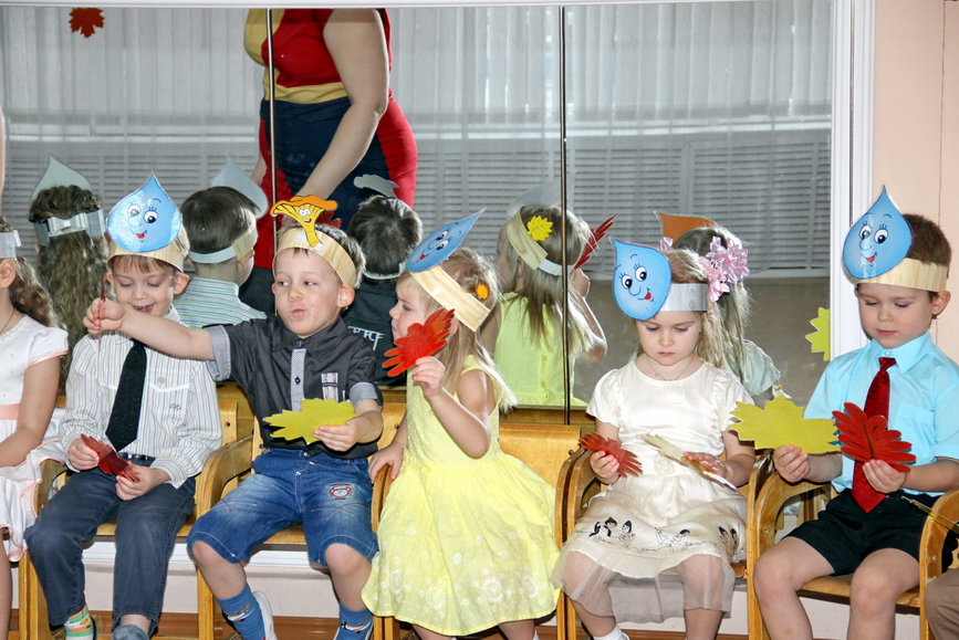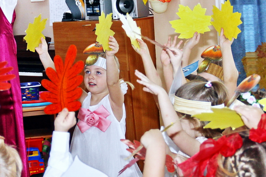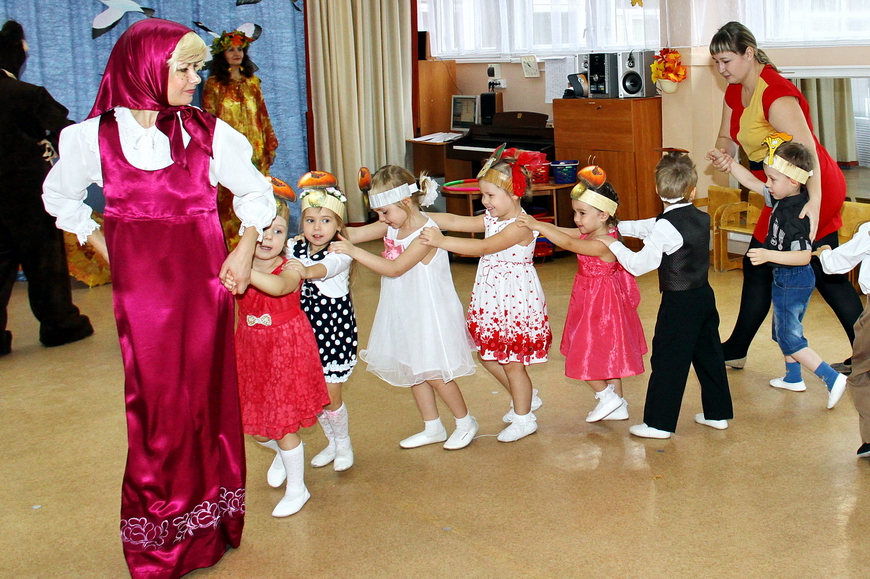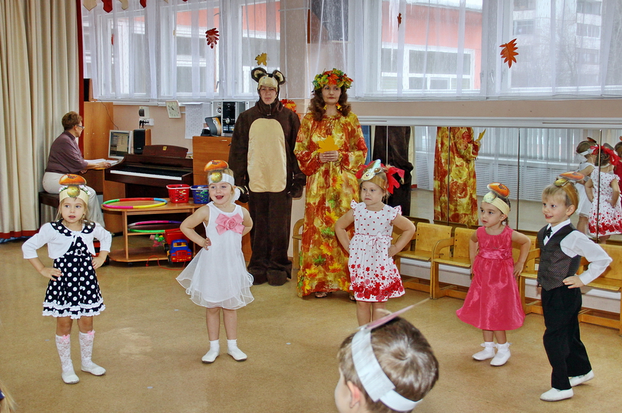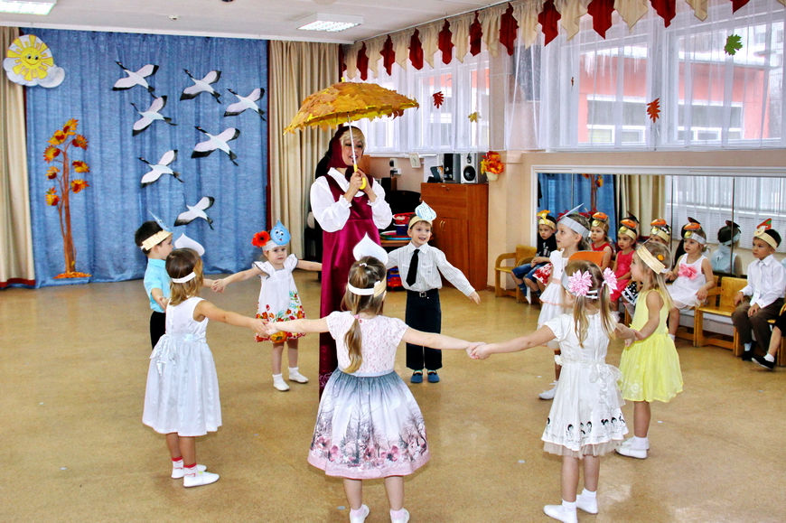 Улыбка каждого ребёнка – как маленький лучик. А если много лучиков собирается вместе – это уже солнце, озаряющее всех своим ласковым теплом.Именно такое солнышко светило нам 30 октября на осеннем развлечении в группах среднего возраста, с участием Маши и Медведя. В программе развлечения были словесные и подвижные игры, танцы и хороводы. Вместо костюмов у детей были ободки «капелек» и «грибочков», с помощью которых дети легко чередовались в танцах и играх. Вместе с детьми веселились Маша и Медведь. Украшением праздника был образ Осени: красивый, грациозный, таинственный. Дети искренне радовались, откликались на шутки героев, были непосредственны и эмоциональны.