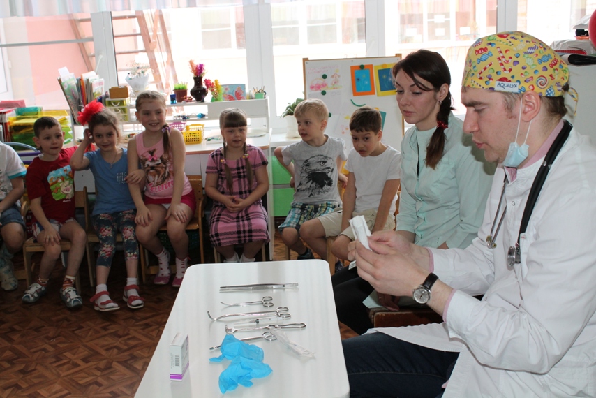 изображение 055И снова интересная встреча в группе № 4. На этот раз дети познакомились с профессией хирурга. Об этой важной и нужной профессии рассказали родители нашей воспитанницы Валерии Федотовой. Антон Алексеевич Федотов хирург МСЧ № 15 и Татьяна Анатольевна Федотова медицинская сестра.