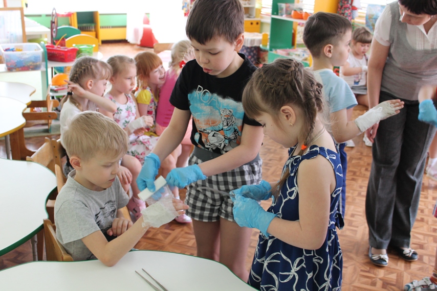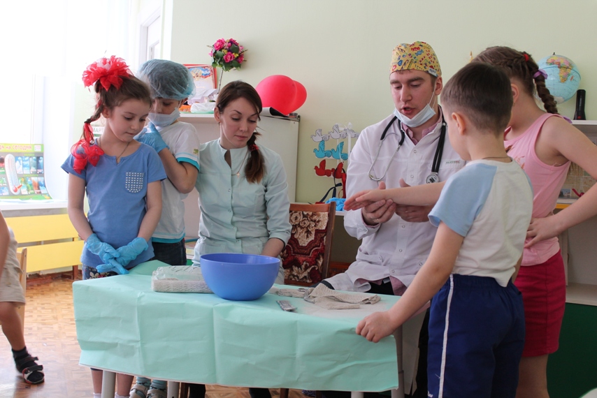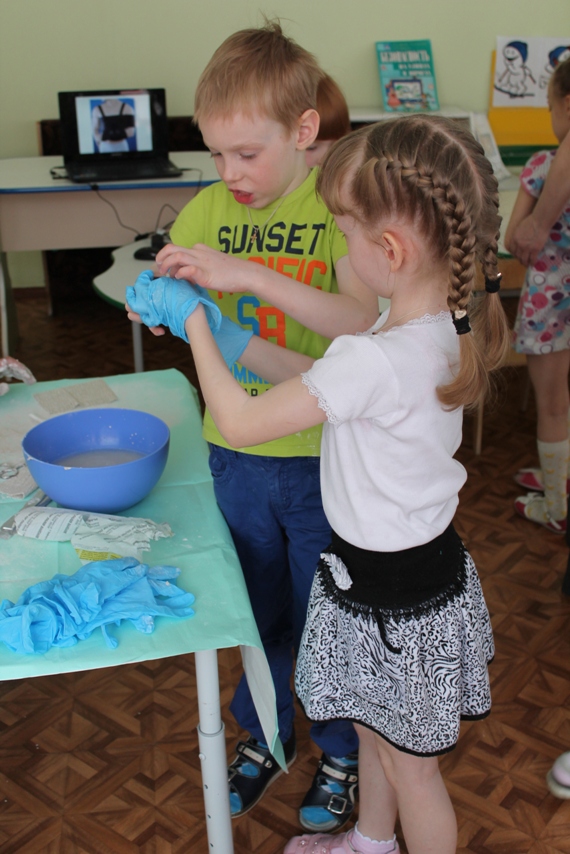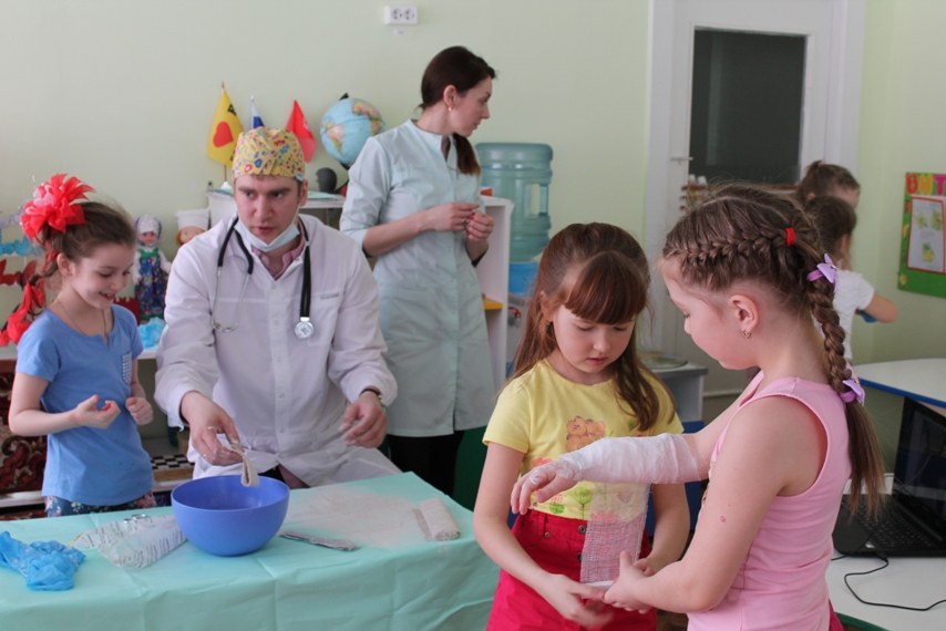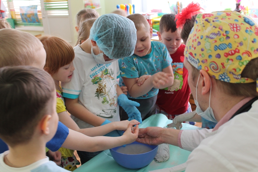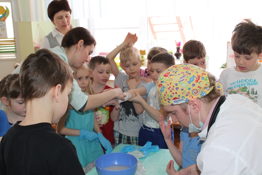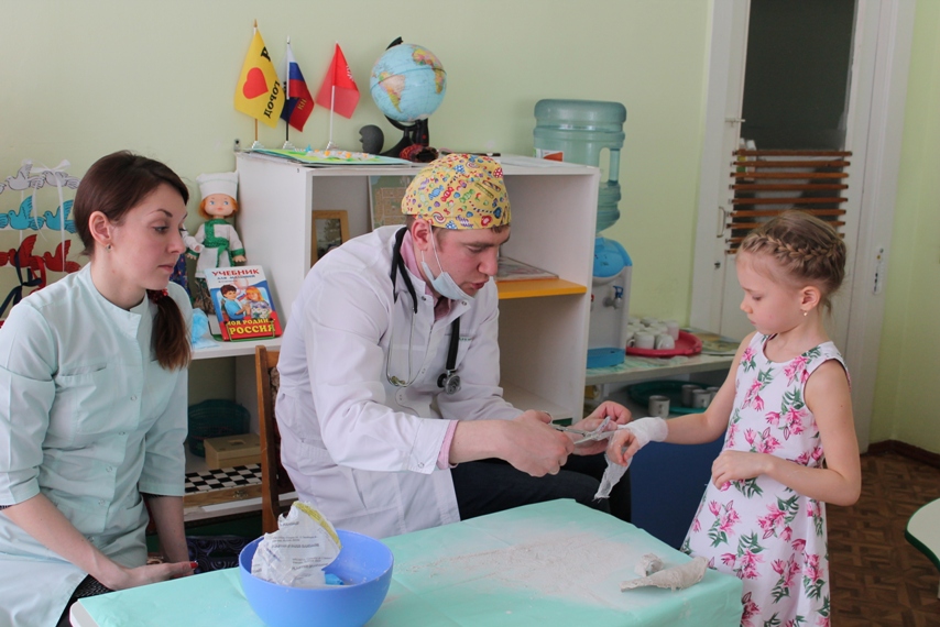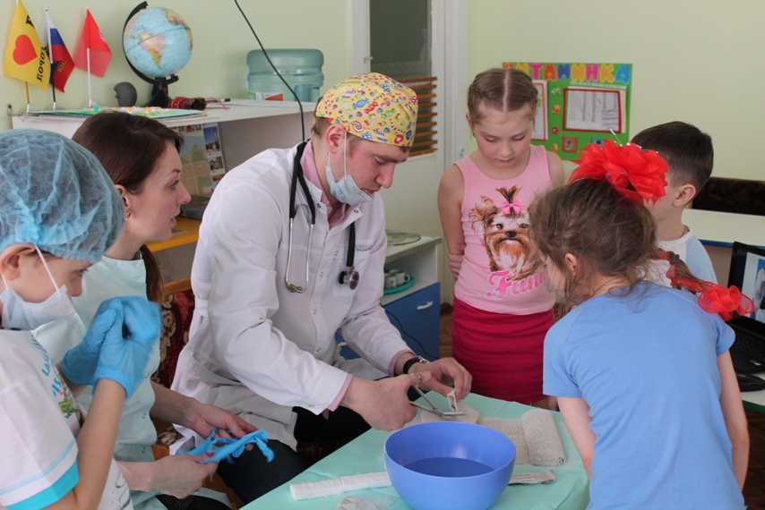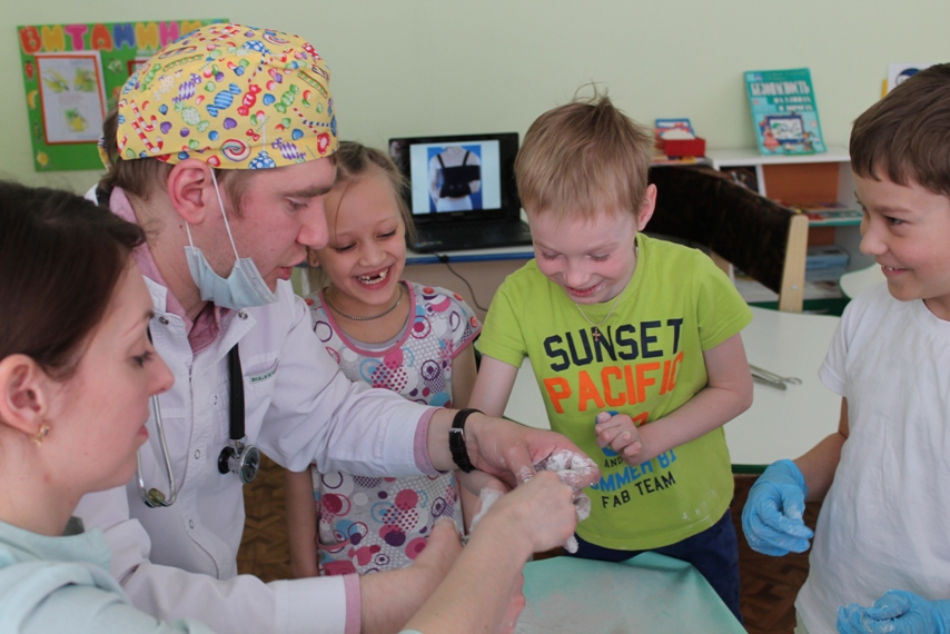 Детей познакомили с некоторыми хирургическими инструментами, очень необычными и интересными, их предназначением, и функциональными особенностями, примерили одежду хирурга. Но самое интересное и запоминающее для детей — это возможность поучаствовать в мастер-классе, на котором каждый из ребят смог побывать в роли врача или пациента. С огромным интересом они накладывали друг другу гипс на разные части рук, конечно, после того, как Антон Алексеевич и Татьяна Анатольевна провели показательное обучение и объяснение, как это правильно делать. В завершении встречи родители Валерии показали видео презентацию об особенностях работы хирурга.