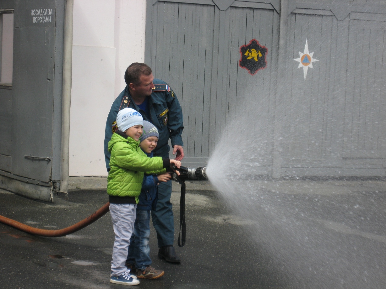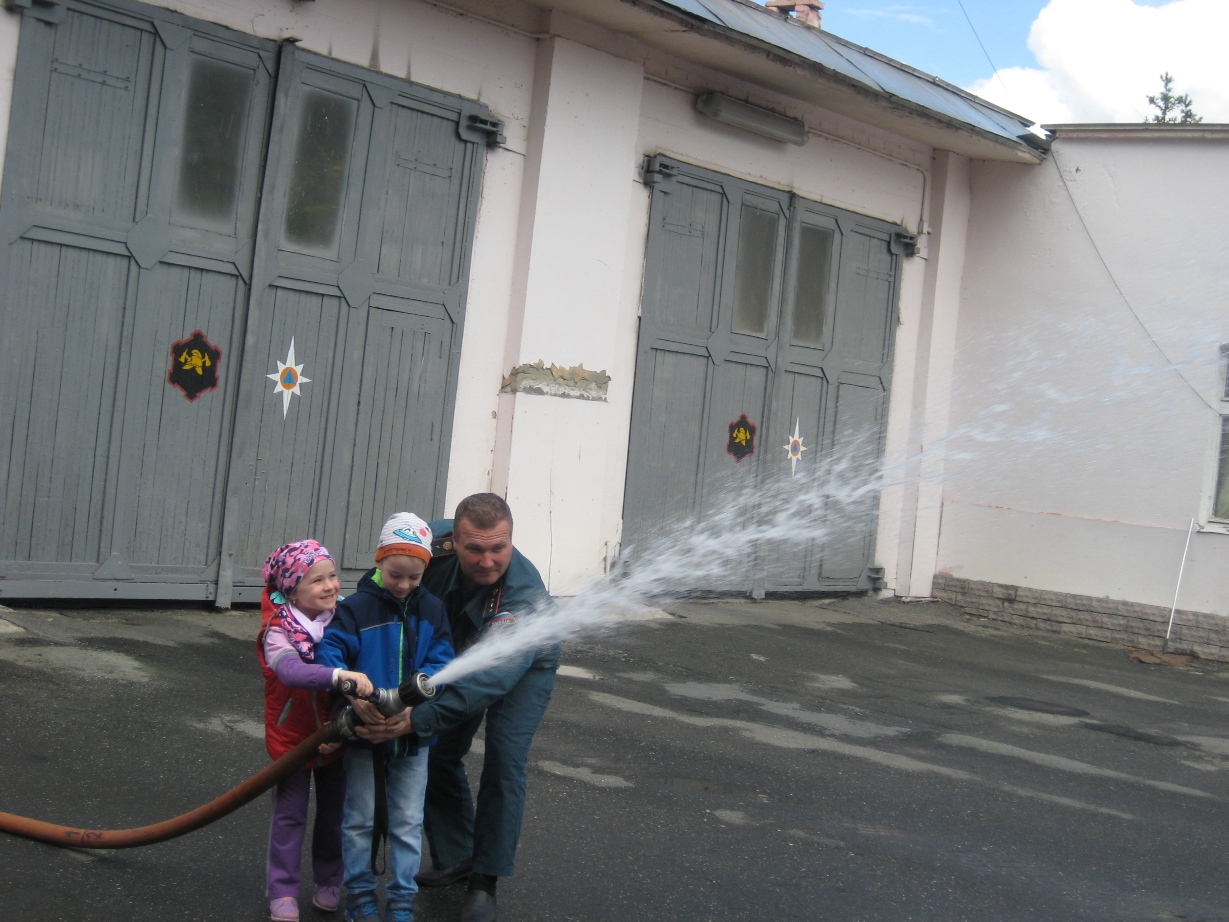И вот мы подъехали к СПЕЦИАЛЬНОЙ ПОЖАРНО-СПАСАТЕЛЬНОЙ ЧАСТИ № 1. Нас встретил Михаил Андреевич Костарев, старший инженер руководитель смены. Он очень интересно рассказал о работе пожарной службы, показал, что находится в пожарной машине, а также одежду, снаряжение, разные приборы и предметы, необходимые для этой очень нужной профессии. Все ребята примерили специальный головной убор пожарного, послушали сирену вызова группы на пожар, а когда забрались в кабину пожарной машины, то смогли посидеть за рулём этой огромной спасательной техники. Незабываемые впечатления остались от возможности подержать в руках пожарный рукав, с бьющей водной струёй. Вот это да! Тут нужны крепкие мышцы и сноровка. А ещё дети с восхищением смотрели, как ловко, быстро и точно Михаил Андреевич забрался на многоэтажное здание с помощью специальной лестницы.